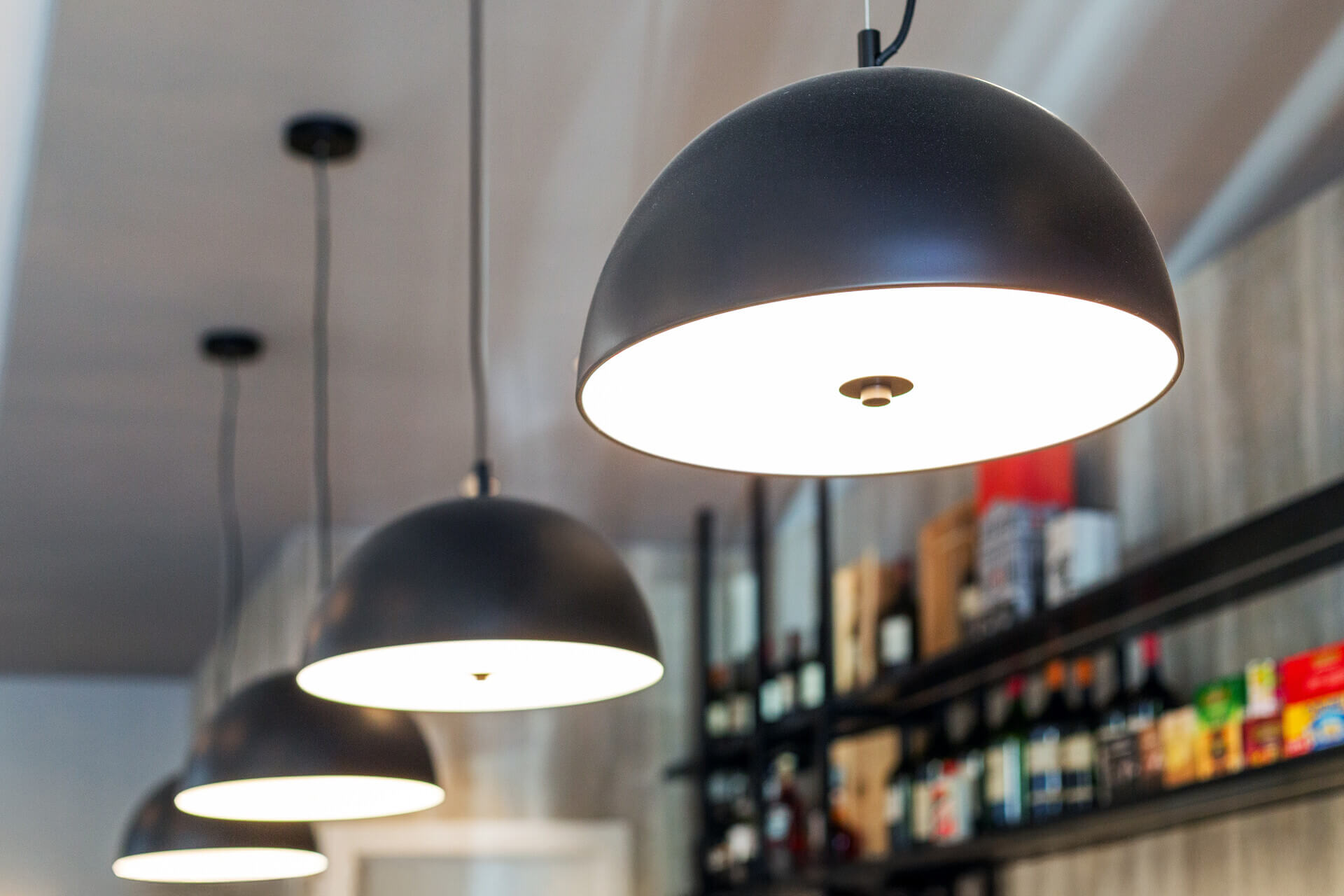 Las paredes están revestidas con superficies que recuerdan el efecto de la piedra natural, añadiendo un toque sofisticado a la vez que acogedor. El techo tiene interesantes cortes de color que crean juegos de volumen y perspectiva, enfatizando la arquitectura de la sala. La iluminación está cuidadosamente diseñada: las lámparas colgantes de diseño minimalista, con acabados en negro mate y líneas limpias, ayudan a crear un ambiente íntimo y relajante.