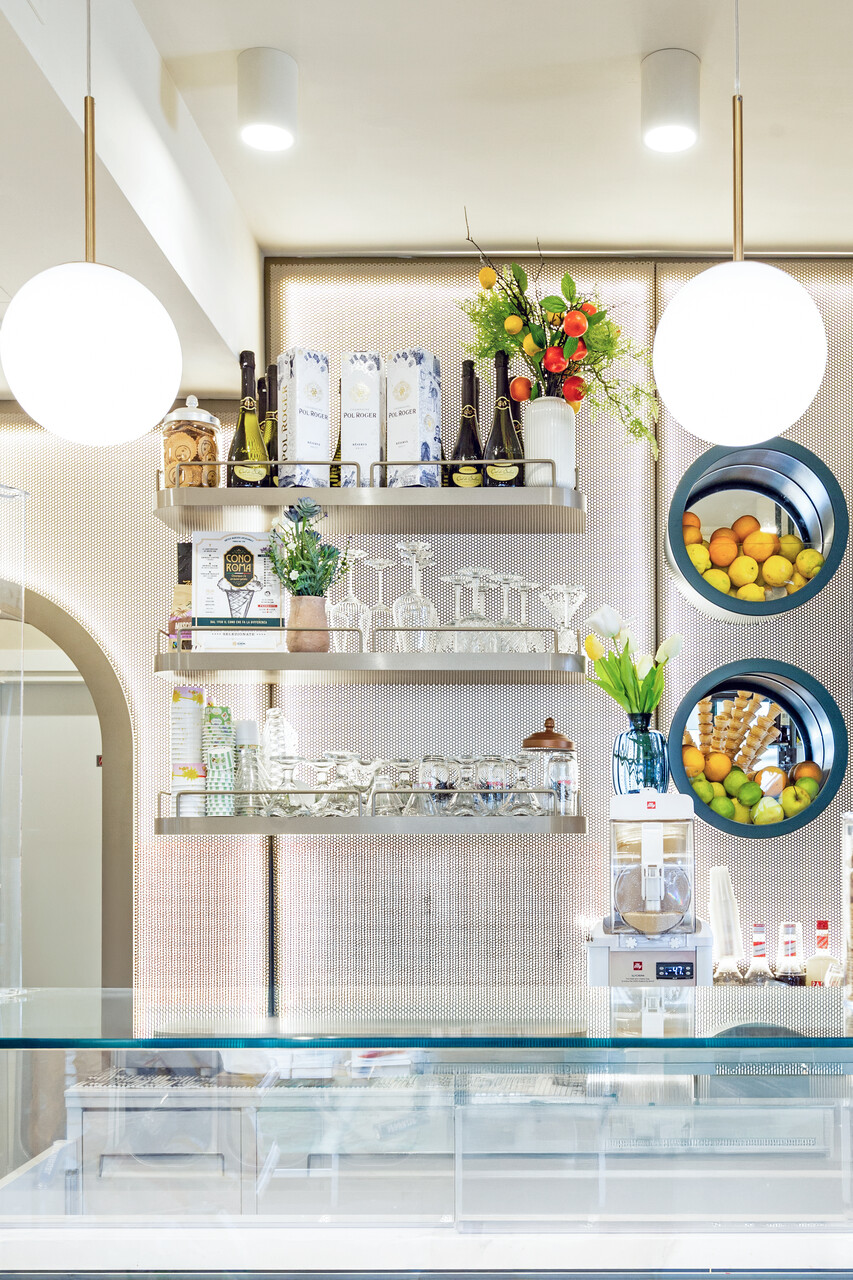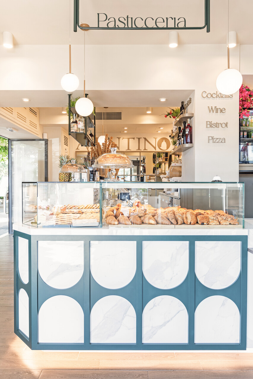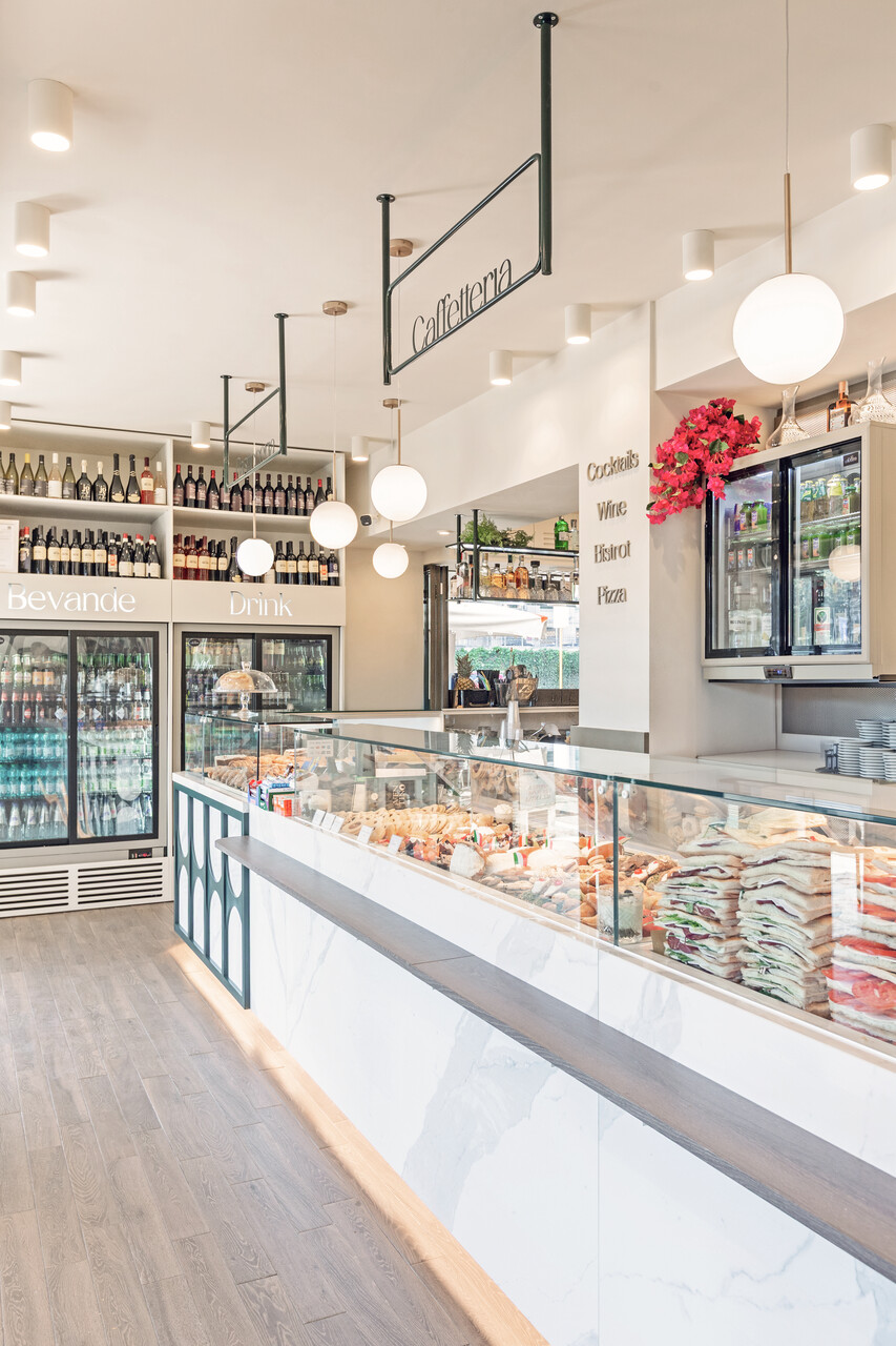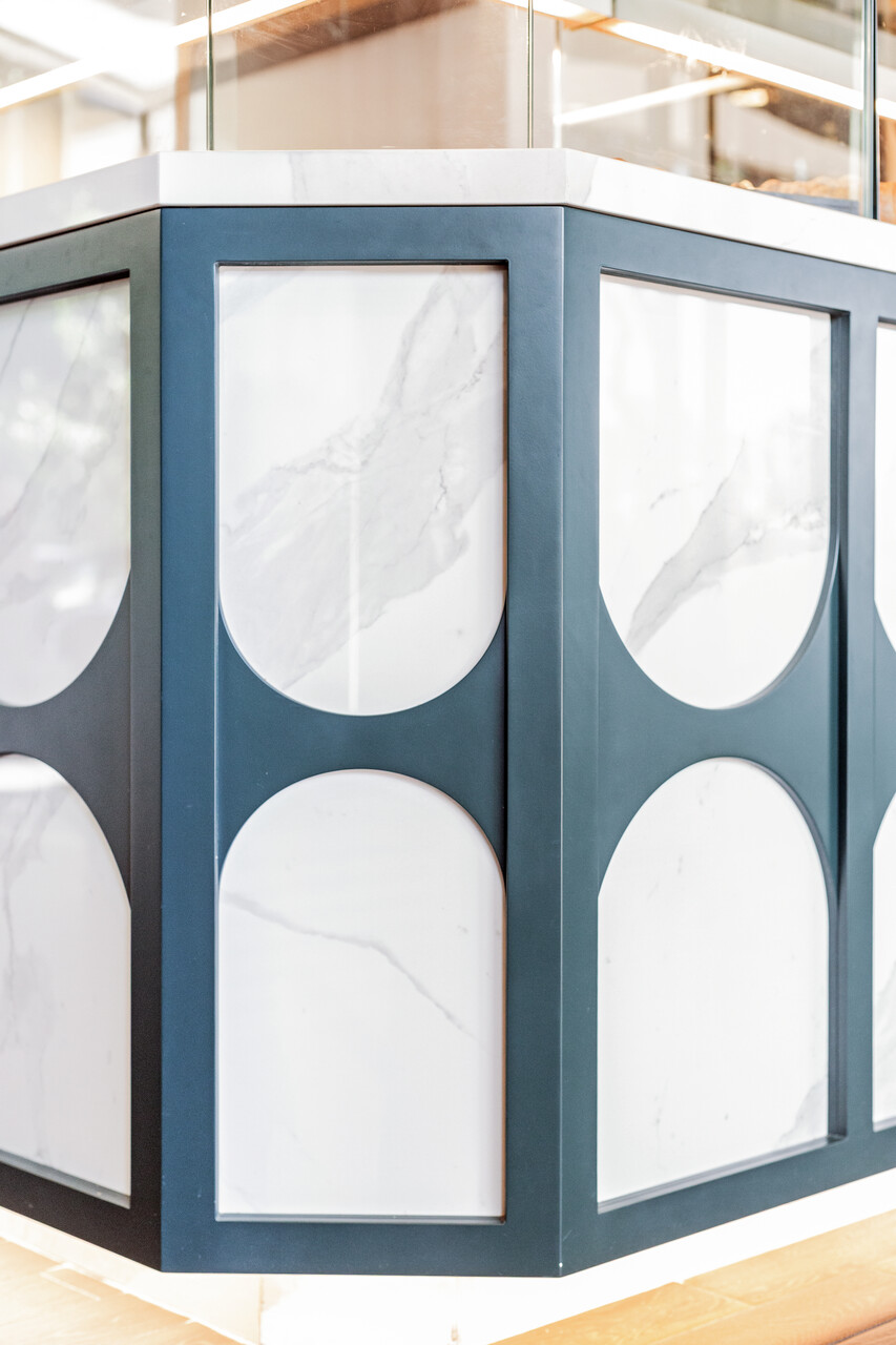 Protagonista assoluto dello spazio è il banco, concepito come fulcro estetico e funzionale del progetto: una composizione scultorea che alterna moduli in gres effetto marmo e cornici in verde intenso. L’elemento dell’arco come elemento grafico richiama volutamente il profilo delle rovine esterne, stabilendo un legame visivo tra interno ed esterno, vecchio e nuovo.